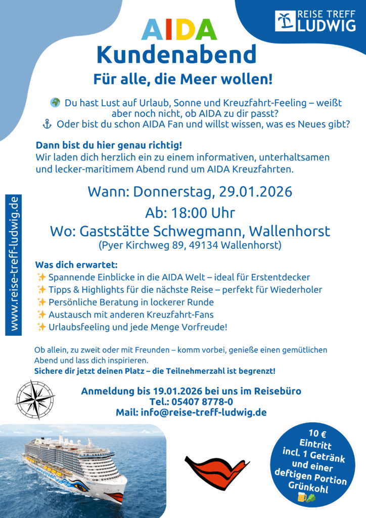 Am 29. Januar 2026 ab 18:00 Uhr laden wir alle AIDA-Neulinge und Kreuzfahrt-Interessierten zu einem ganz besonderen Infoabend ein – unverbindlich, persönlich und inspirierend.